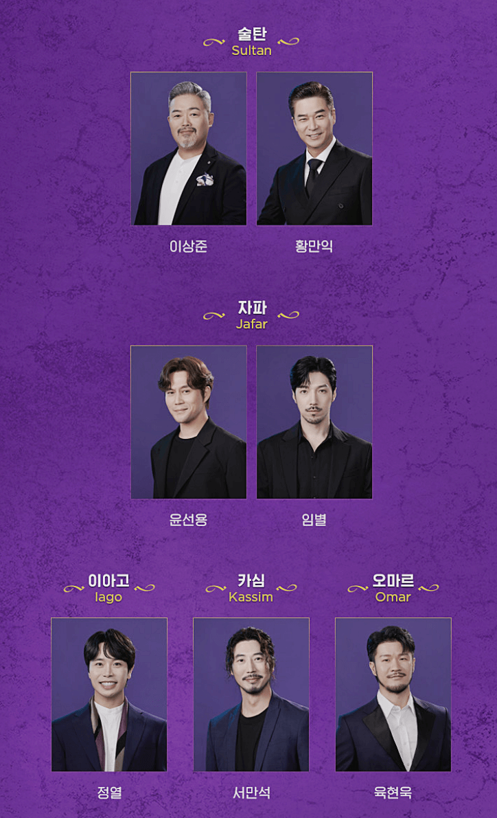 가난한 거리 소년이지만, 마음 속에는 모험과 사랑에 대한 열망이 가득합니다. 그는 마법의 램프를 통해 지니를 만나고, 공주 자스민과 사랑을 이루기 위한 여정을 시작합니다. 알라딘 역은 보통 청년미 넘치고, 노래와 춤 실력이 뛰어난 배우가 맡습니다.