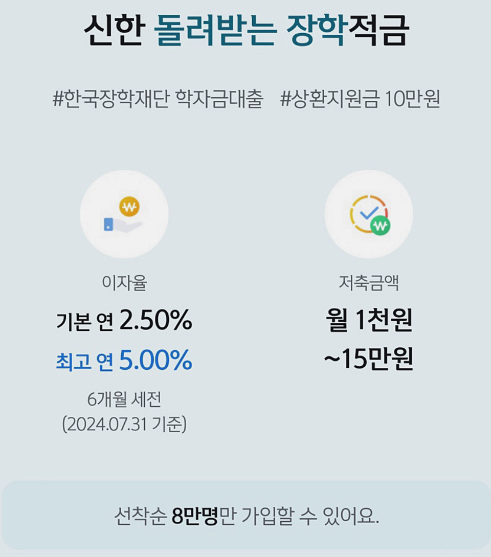 - 최고 연 5.0% 금리 + 상환지원금 10만 원: 학자금 대출 상환계좌를 보유한 고객이 대상입니다.