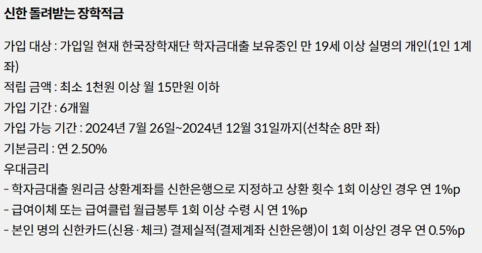 - 이 상품은 한국장학재단 학자금대출 상환계좌를 보유한 고객에게만 제공되며, 상환계좌가 없는 경우 가입이 불가능합니다.